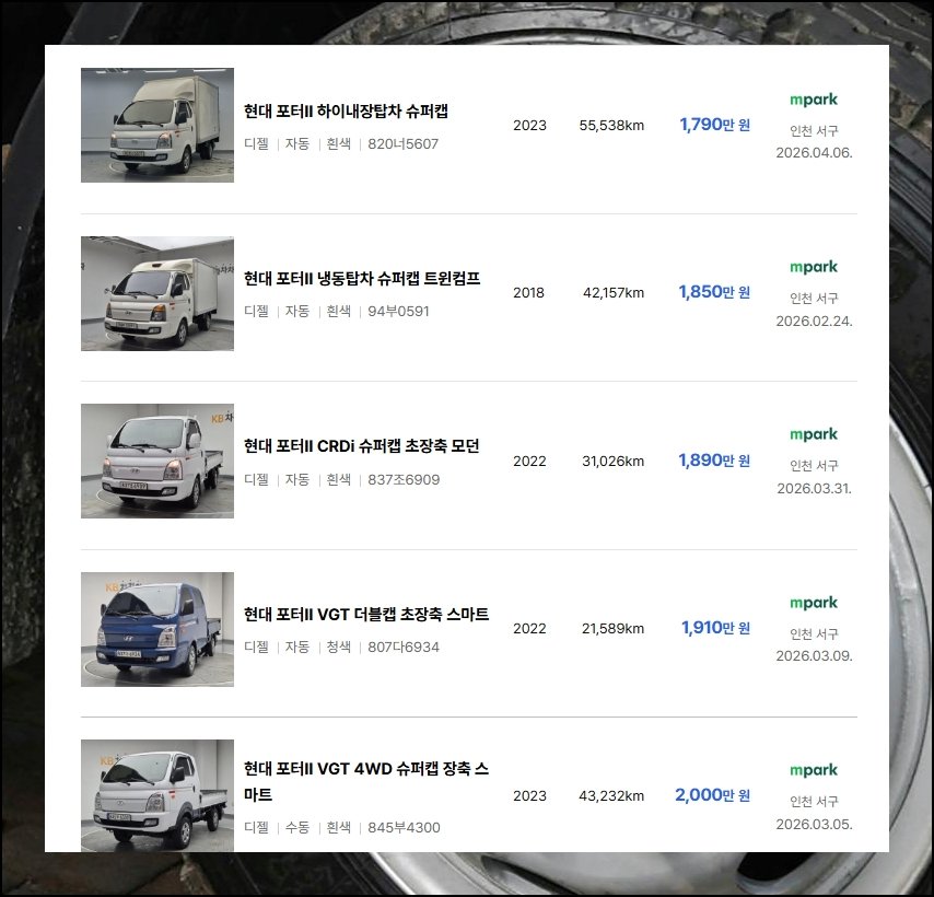 1톤트럭 중고차 시장에 올라오는 물건이 부쩍 늘었어요. 거래 플랫폼을 열어 보면 출고 시기나 누적 운행 거리, 판매 금액 같은 핵심 사항이 깔끔하게 나와 있습니다. 운행 거리가 상당히 쌓인 1톤트럭은 500만원대 초반부터 잡을 수도 있더라고요. 그렇지만 시세보다 눈에 띄게 낮은 중고차는 겉으로 드러나지 않는 결함이 있을 수 있으니 서두르지 말고 천천히 따져보시는 편이 안전합니다.