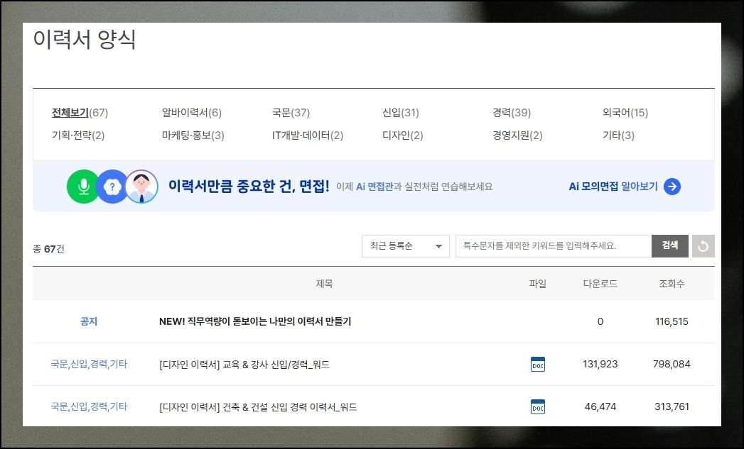 처음 구직에 나서면 서류 준비부터 벽에 부딪히는 경우가 많습니다. 어디서 괜찮은 양식을 구해야 할지, 어떤 형식이 적절한지 판단하기가 쉽지 않아요. 사람인에서는 검증된 이력서 양식 무료 다운로드 서비스를 운영하고 있어 이런 막막함을 빠르게 덜어줍니다. 이미 수십만 지원자가 활용한 서식이라 신뢰도도 높은 편이에요.