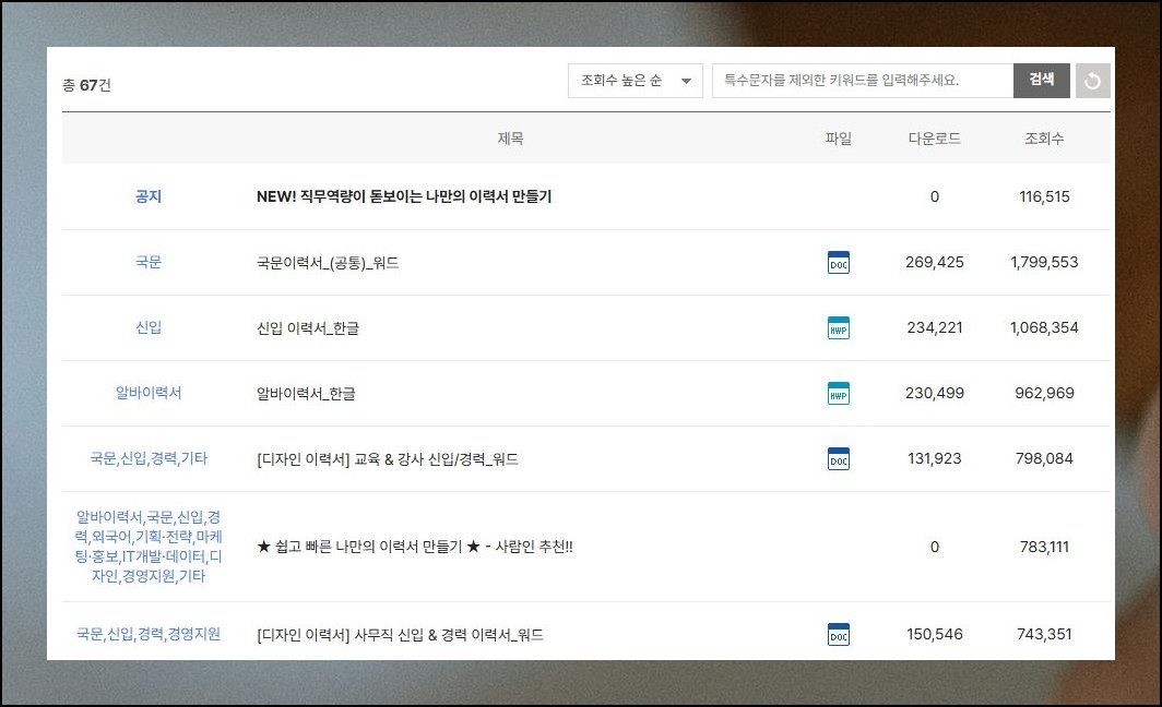 다양한 이력서 가운데 어떤 것을 다운로드할지 결정이 어렵다면 선호도 순위를 확인해 보세요. 열람 빈도와 내려받기 횟수가 훌륭한 선택 잣대가 됩니다. 파일 확장자는 DOC, HWP, XLS 중 평소 다루기 편한 쪽으로 정하면 충분해요.