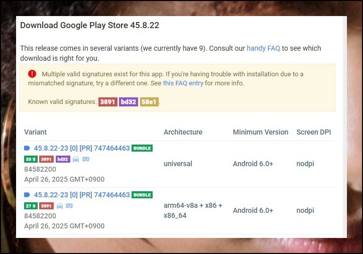 원하는 구글 마켓 버전을 누르면 동일한 버전이어도 규격이 다른 APK가 여럿 보입니다. 이때 아키텍처와 구글에서 요구하는 안드로이드 최소 버전을 꼼꼼히 살피세요. 내 기기의 OS 정보는 설정에서 정보 항목을 열면 바로 확인 가능해요. 이 데이터를 토대로 호환되는 파일을 골라야 탈 없이 돌아갑니다.