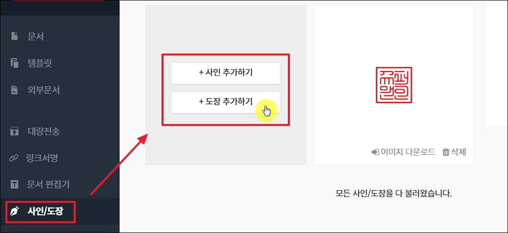 ▼로그인을 하면 다음과 같은 관리 페이지가 열립니다. 여기에서 좌측 하단에 있는 [사인/도장] 메뉴를 클릭해 주세요. 그럼 우측에 사인과 도장을 추가할 수 있는 버튼이 나타납니다. 기존에 만든 인터넷 도장 이미지도 보이네요.
