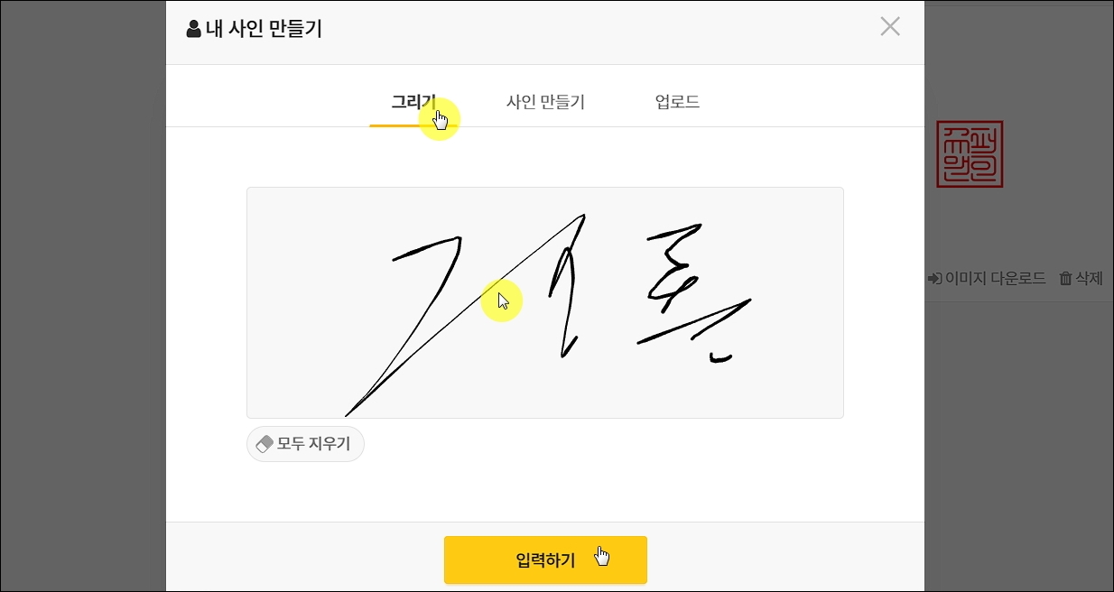 ▼요즘에는 사인을 많이 사용하기도 하는데요. 인터넷 상에서 사용할 사인만들기 또한 여기서 진행할 수 있습니다. 사인을 만드는 방식은 2가지가 있는데요. 프로그램 메뉴에서 [그리기]를 선택하면 마우스로 사인을 직접 그리는 방식으로 인터넷 사인을 제작할 수 있고, [사인 만들기] 메뉴를 선택하면 도장을 만들 때와 같이 내용을 입력하고, 디자인을 선택하는 방식으로 사인 제작을 진행할 수 있습니다.