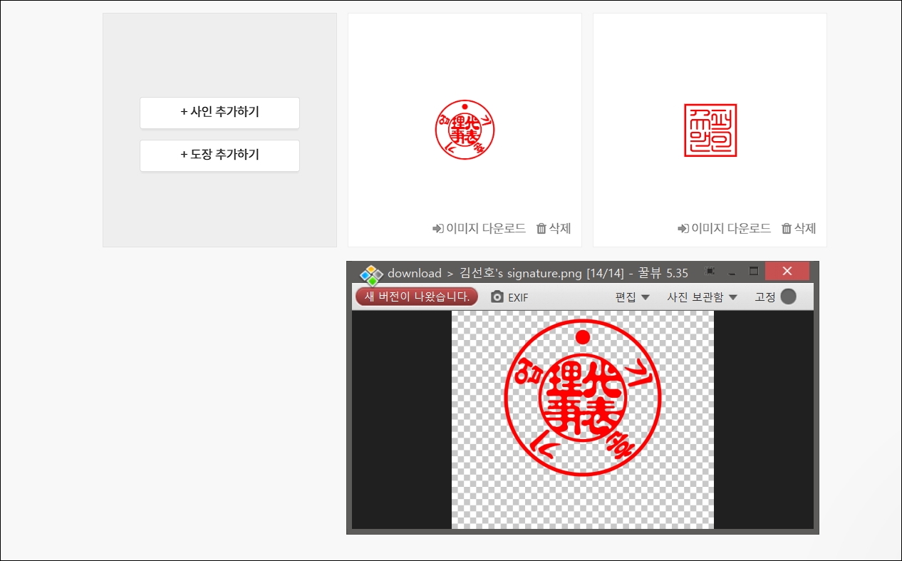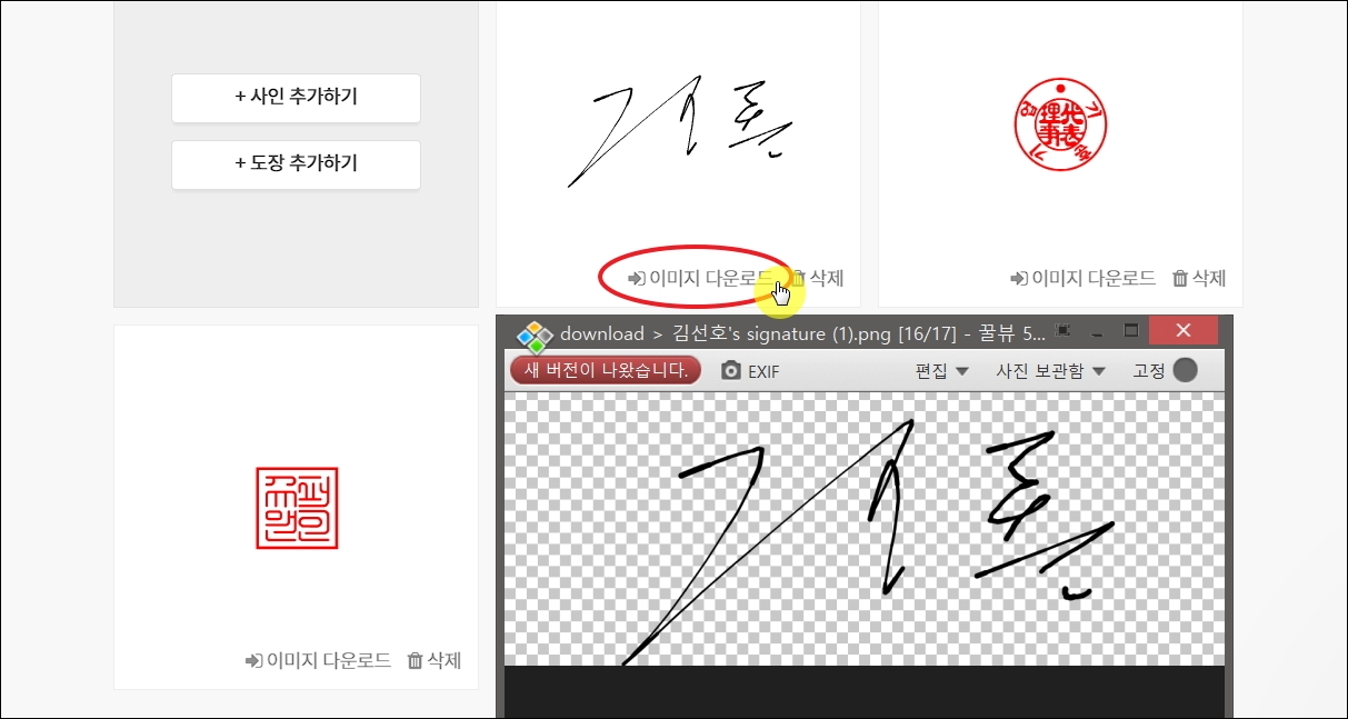 ▼직접 그려서 만든 사인에 대해서도 이미지 파일로 다운 받을 수 있습니다. PNG 파일을 열어보면 아시겠지만, 배경이 투명으로 되어 있습니다. 이렇게 되어 있으면 어떤 문서에든 이질감 없이 도장이나 사인을 추가할 수 있어서 좋아요.