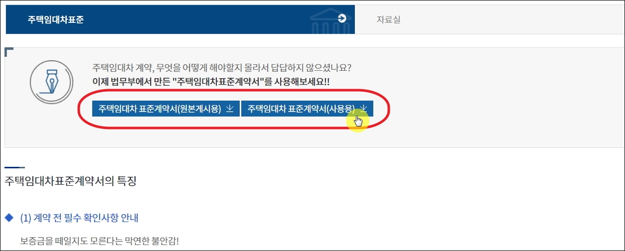 ▼주택임대차 표준 페이지가 열렸습니다. 여기서 "주택임대차 표준계약서(사용용)"이라고 되어 있는 버튼을 클릭해 보세요. 그럼 무료로 사용할 수 있는 양식 파일을 내려 받을 수 있습니다.