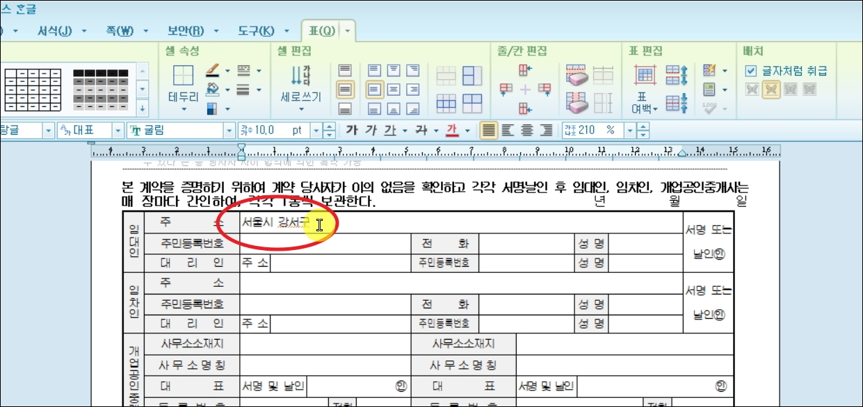 ▼pdf 파일로 되어 있는 원본게시용 양식과 다르게 사용용 파일은 내용 입력 및 수정을 손쉽게 할 수 있도록 hwp 파일로 되어 있습니다. hwp 파일은 아래아 한글 프로그램을 통해 열람 및 편집이 가능한데요. 다음과 같이 빈 칸을 마우스로 클릭하면 타자 입력으로 내용을 채울 수 있습니다.