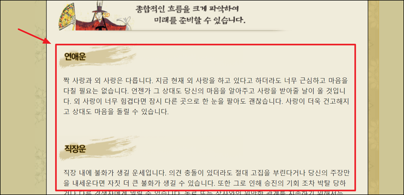 연애운에 대한 무료 풀이를 살펴보니 재미있는 부분이 보이네요. 짝사랑과 외사랑에 대한 운세 내용인데요. 외사랑의 경우 상대가 사랑을 받아줄 날이 온다고 하네요.