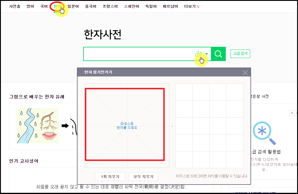 검색기에서 우측에 있는 [필기 인식기] 버튼을 눌러 보세요. 그럼 문자를 그리는 방식으로 손쉽게 한자를 입력할 수 있습니다.
