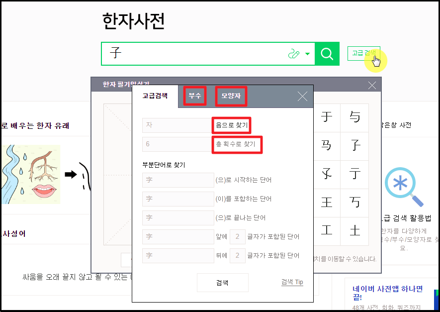 ▲ 또 다른 한자 입력 방법을 알려 드리겠습니다. [고급 검색] 기능을 사용하는 것인데요. 음, 획수, 부수, 모양자 등을 이용하여 검색기에 넣을 한자를 입력할 수 있습니다.