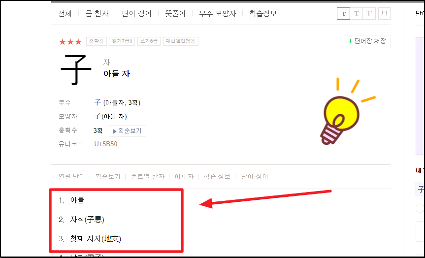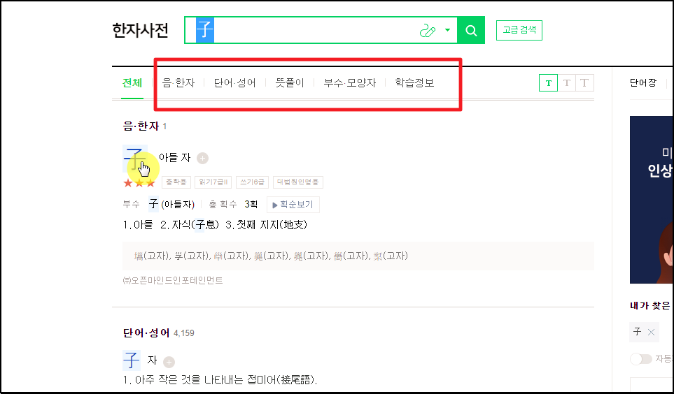 ▲ "아들 자"라는 문자를 검색한 결과입니다. 관련된 단어, 성어, 뜻 풀이, 부수, 모양자, 학습 정보가 나타납니다.