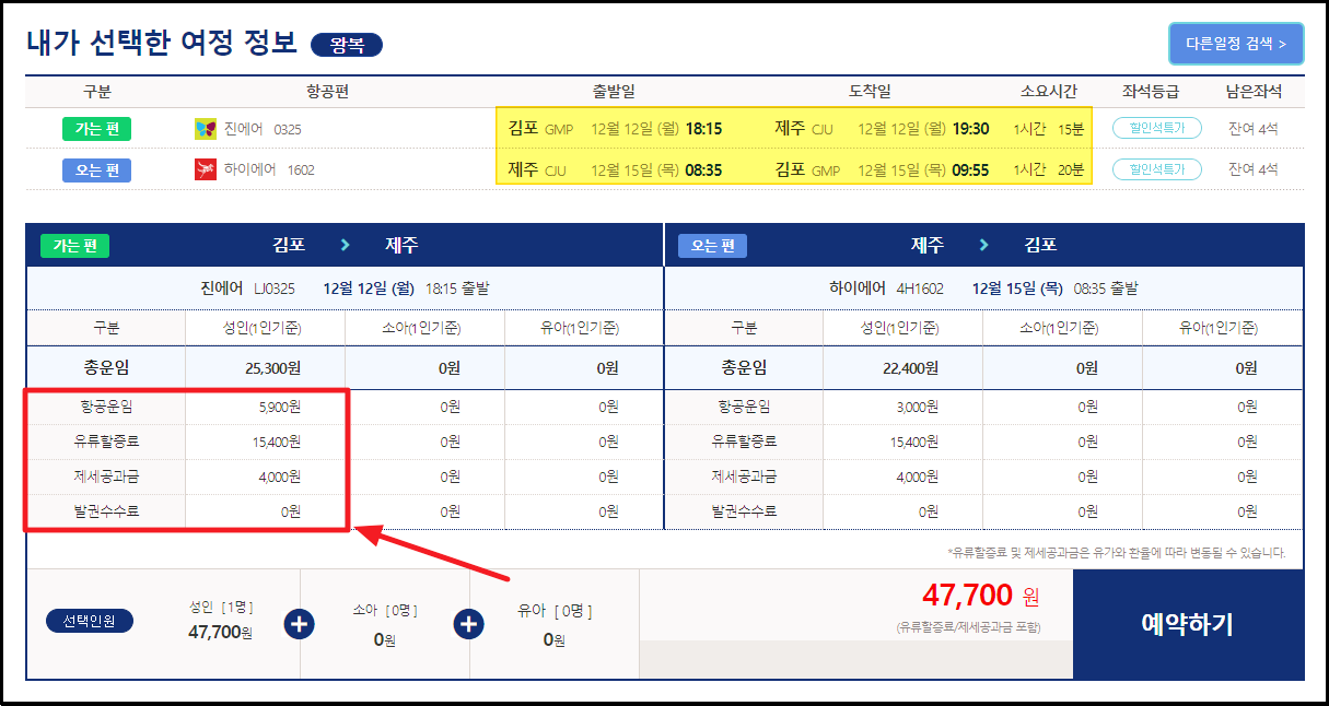 ▲ 12월 중순에 탑승하게 되는 제주도 항공권을 찾아 보았습니다. 왕복으로 47,700원에 구입하는 것이 가능한데요.
