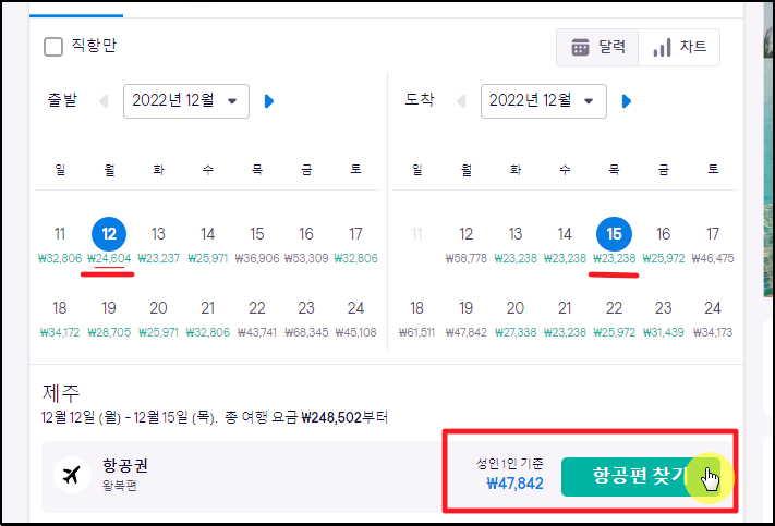 각 날짜에 표시된 가격을 비교하여 본인의 여행 일정에 맞게 날짜를 선택해 주세요. 저는 2박 3일로 다녀올 수 있는 날짜를 선택했는데요. 최저가로 47,842 원이네요.