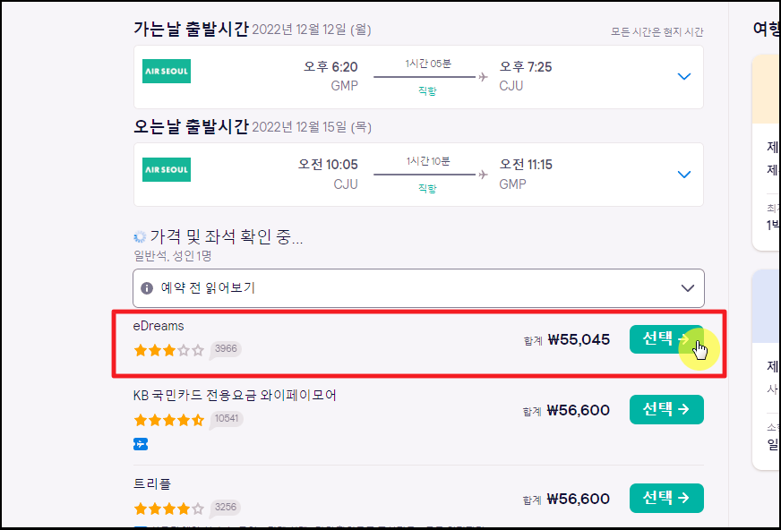 ▲ 마음에 드는 항공편 선택을 하게 되면 제주도 항공권에 대한 예약을 도와줄 업체 및 사이트를 선택해야 하는데요. 전화 업체에서 제시하는 금액이나 해당 업체의 평점을 참고하여 선택하면 됩니다.