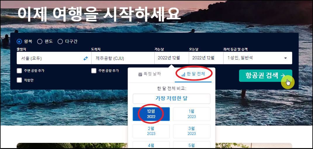 여기서 꿀팁 하나 알려드리겠습니다. 비행기 탑승 날짜는 가능하면 월 단위로 지정해 주세요. 이렇게 하면 최저가 찾는 데에 도움이 돼요.