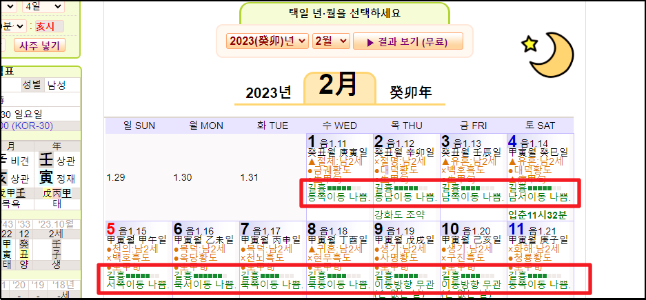 위에 보이는 택일 만세력의 경우에는 조금 다른데요. 각 날짜에 따라 길하고 흉한 정도를 알려줍니다. 행운이나 불운을 가져다 주는 이동 방향에 대한 정보도 제공하고 있죠.