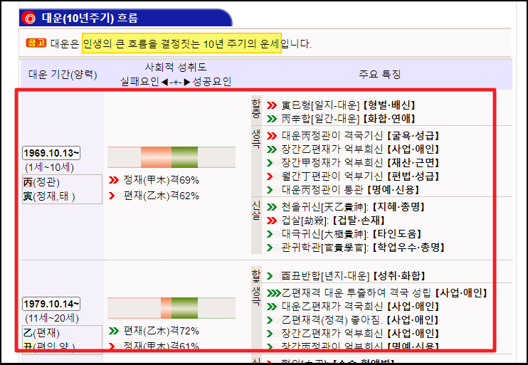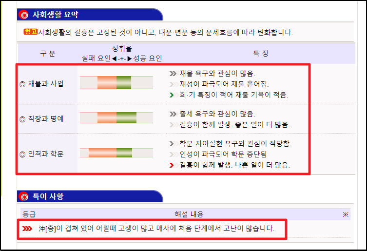 바로 사회생활 요약 부분인데요. 나의 재물, 직장, 인격, 사업, 명예, 학문에 대하여 알려줍니다. 참고로 대운과 연운 등의 운세 흐름에 따라 변화하는 부분이기 때문에 좋지 않은 결과가 나왔다고 해서 너무 실망할 필요는 없습니다.