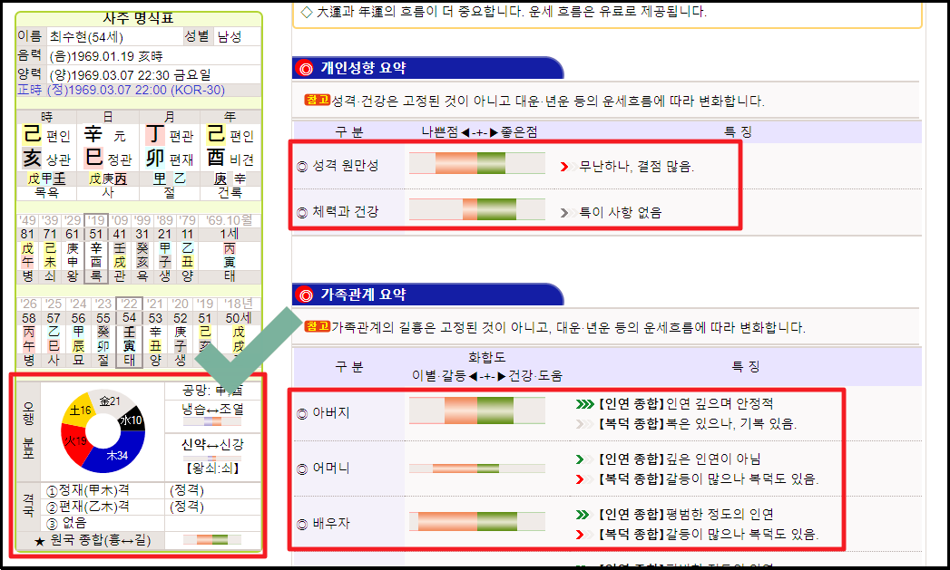 해당 프로그램에서는 다른 사이트에서 제공하는 만세력 서비스와는 다르게 개인성향, 가족관계, 사회생활에 대한 내용도 포함되어 있어요. 나름 해석도 상세한 편이라서 이해하기에도 수월합니다.