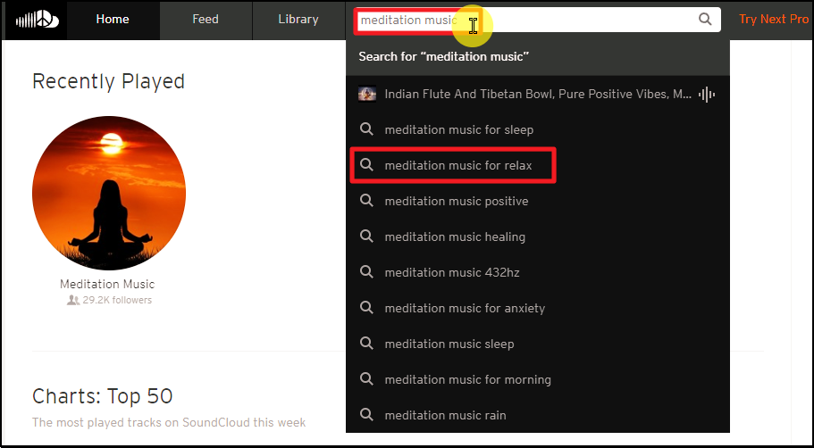 여기서 연속듣기 하고 싶은 명상음악을 찾는 방법을 알려드리겠습니다. 화면 상단에 보면 검색을 할 수 있도록 되어 있는데요. 여기에 "meditation music"을 입력한 후 검색 버튼을 눌러주세요.