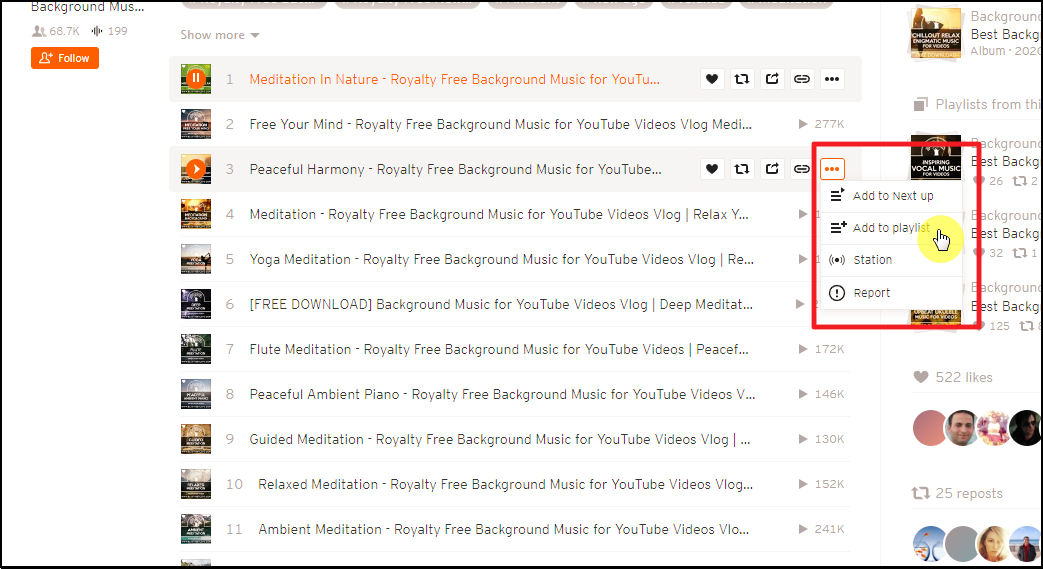 좋아요 갯수나 플레이 횟수도 나와 있으니 연속으로 듣고 싶은 명상음악을 찾을 때 참고하시길 바랍니다.