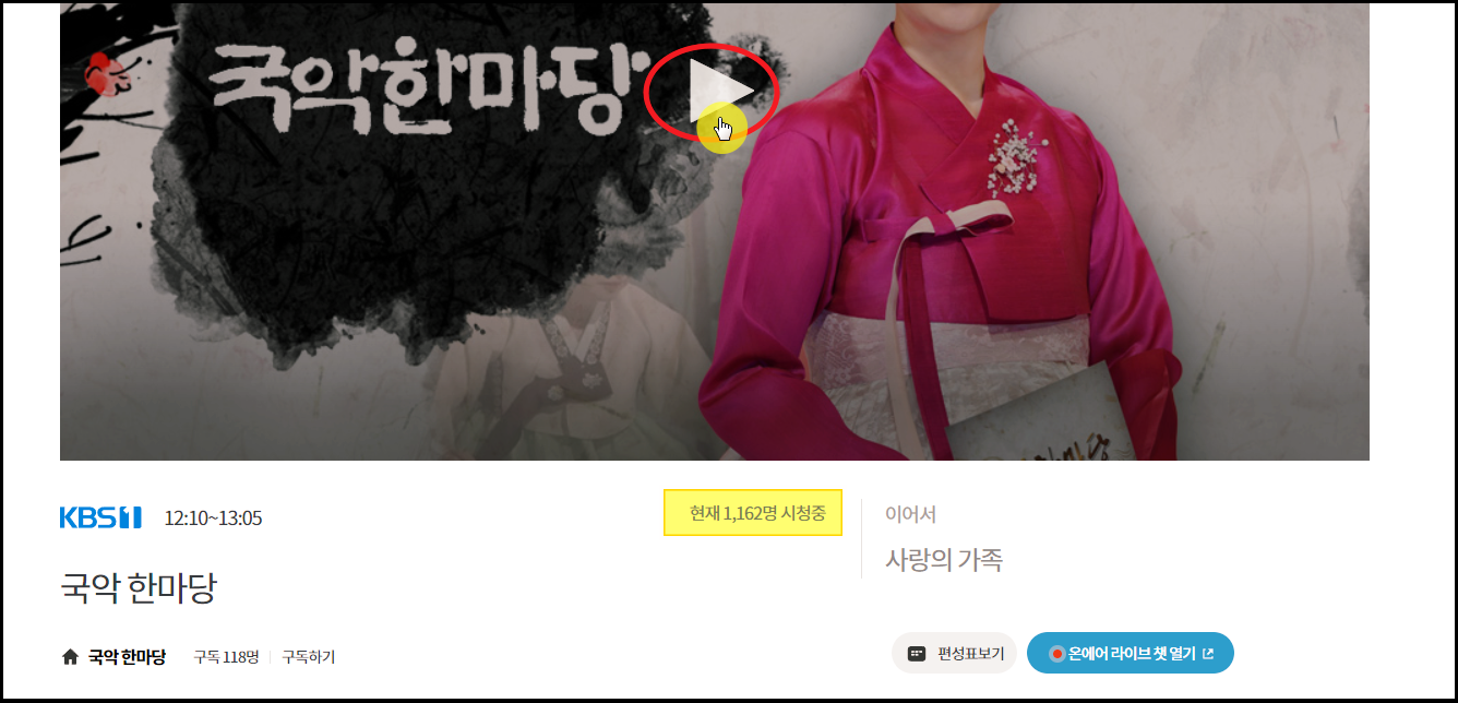 ▲ 이번에는 kbs1 채널을 선택해 보았어요. 유명한 "국악 한마당"이라는 프로그램이 방영 되고 있는데요. 이 또한 1,162명의 시청자와 실시간으로 채팅을 할 수 있습니다.