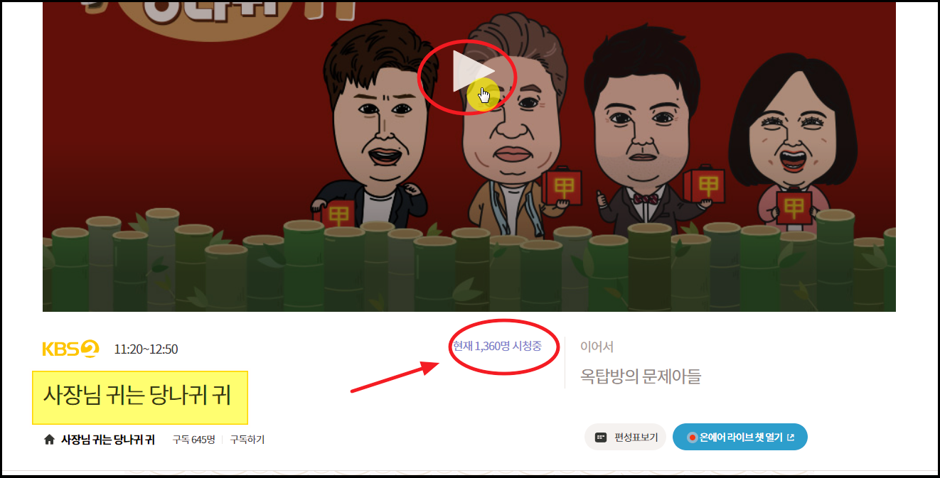 온에어 서비스가 바로 tv에 실시간으로 나오는 프로그램을 시청하도록 해주는 서비스인데요. 여기에 보면 kbs2 TV에서 "사장님 귀는 당나귀 귀"라는 프로그램이 방영 되고 있네요.