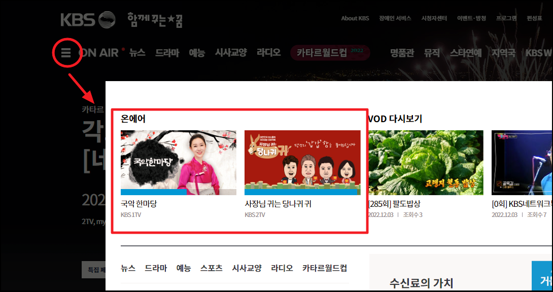 ▲ 공식 홈페이지에 접속하면 좌측 상단에 전체 메뉴 버튼이 있습니다. 이 버튼을 눌러 보세요. 그럼 오늘 서비스와 VOD 다시보기 서비스가 나타납니다.