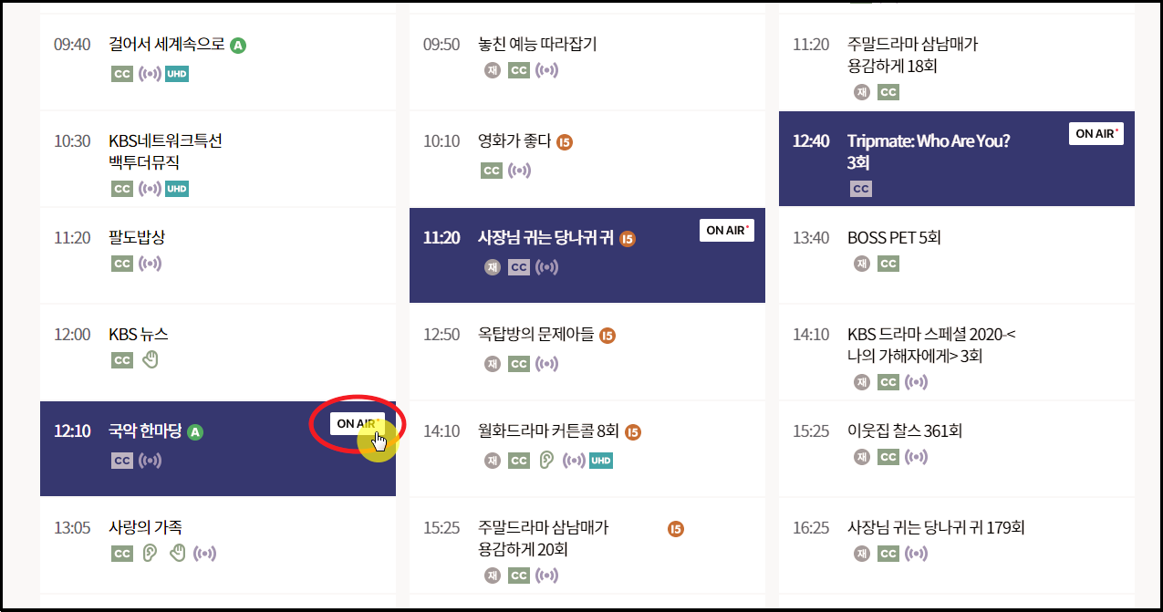 ▲ 편성표을 보다 보면 특정 프로그램에 온에어 버튼이 표시된 경우가 있는데요. 이 버튼은 현재 TV에서 실시간으로 방영되는 경우에 나타나요. 해당 버튼을 누르면 바로 TV를 시청할 수 있습니다.