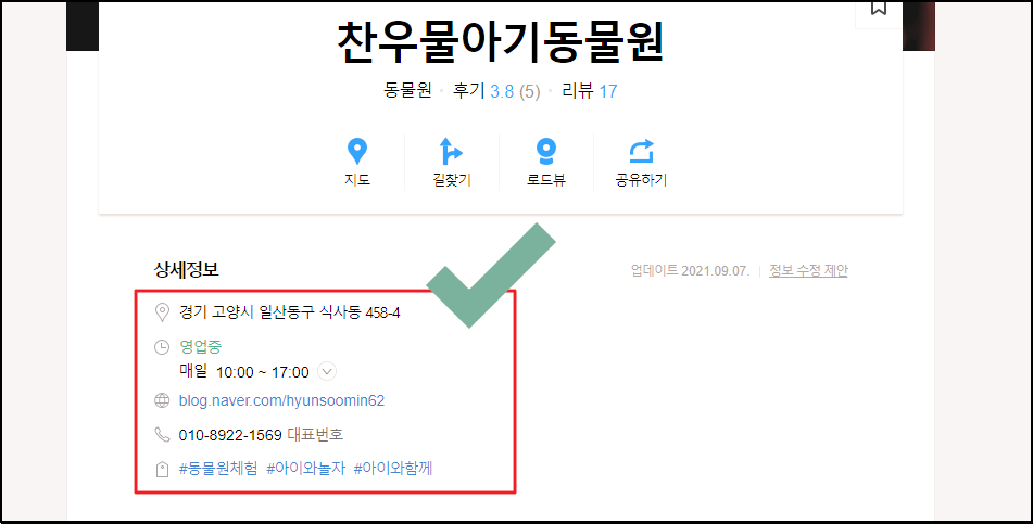▲ 상세정보를 통해 정확한 주소, 영업 시간, 관련 웹페이지, 대표 전화번호, 관련 태그, 관련 사진, 리뷰, 후기 등 많은 것을 알아볼 수 있습니다. 이런 식으로 간단하게 전화번호로 주소찾기 할 수 있습니다.