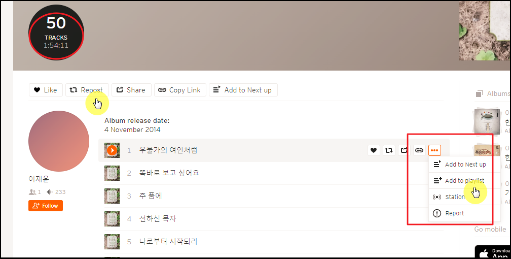 ▲ 앨범에 대한 상세한 정보가 나타나 있는 페이지가 열렸습니다. 여기에서 보면 이 앨범을 재생하면 한 번에 1시간 54분 동안 연속듣기 가능한 것으로 나와 있네요.