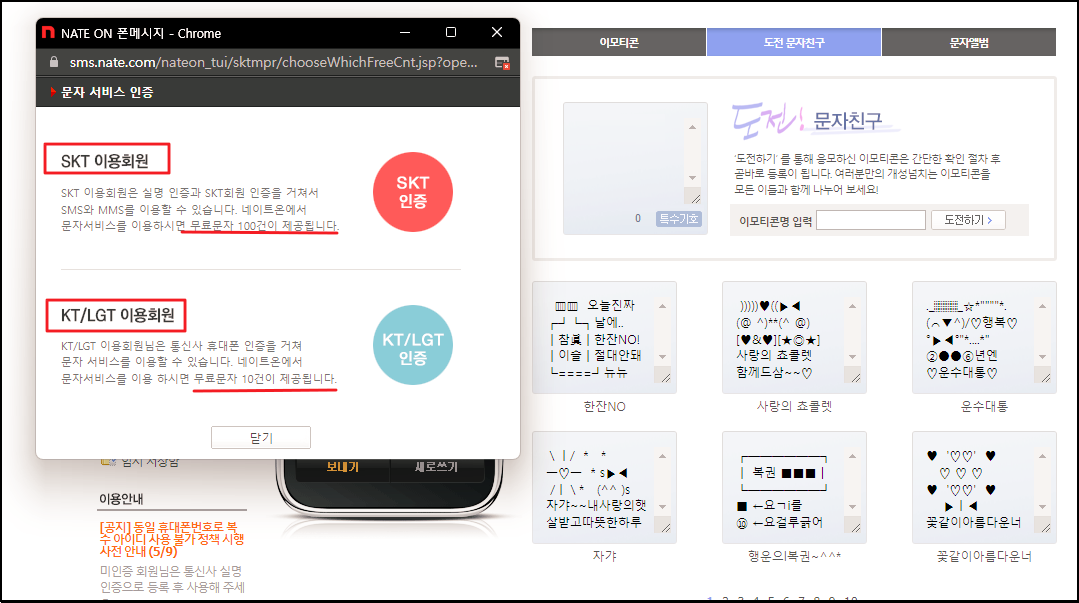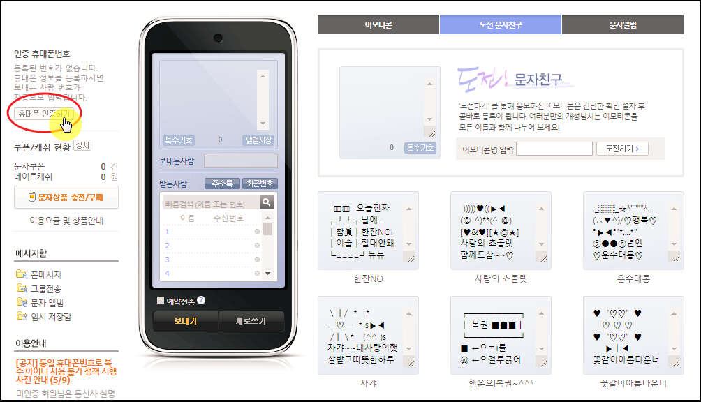 ▼ 화면에 나타난 스마트폰을 이용하여 메세지 보내기를 할 수 있는 서비스 페이지가 열렸습니다. 여러 가지 이모티콘을 사용할 수 있는 것도 좋고, 키보드로 메세지 내용을 입력할 수 있어서 편리합니다. 일단 무료문자 보내기 위해서는 좌측 상단에 있는 "휴대폰 인증하기" 버튼을 눌러 휴대폰번호에 대한 인증을 해야 합니다. 앞서 언급한 바와 같이 SKT는 100건, KT는 10건, LGT는 10건의 무료문자를 제공 받을 수 있습니다.