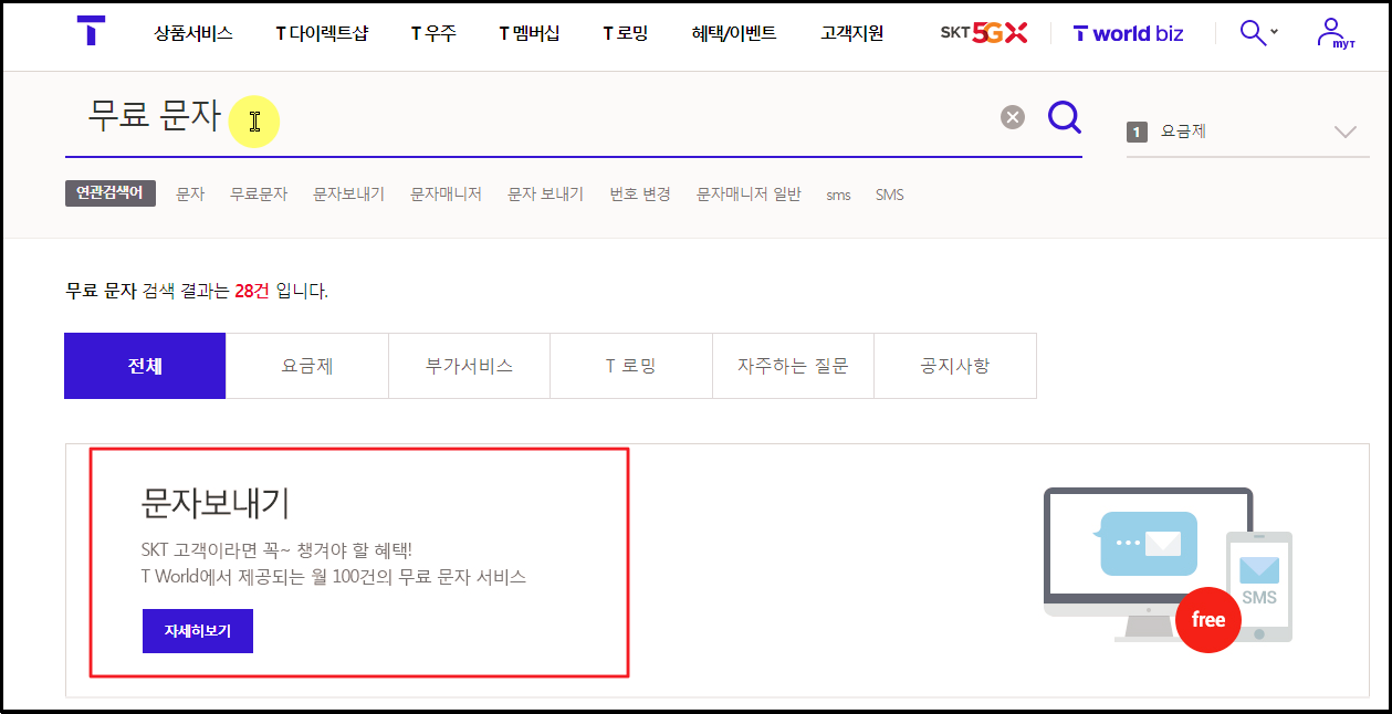 ▼ 티월드의 경우에는 사이트에 접속해서 사이트 내부에 대한 검색창을 통해 "문자 보내기"라고 검색을 하면 됩니다. 그럼 매월마다 100건의 무료문자를 제공하는 서비스를 이용할 수 있다고 하네요. 저는 알뜰폰을 사용하고 있기 때문에 진짜 되는지 실험을 해보지는 못했습니다. 하지만 티월드에 명확하게 명시가 되어 있는 만큼 무상으로 메세지 보내기 할 수 있다고 판단됩니다.