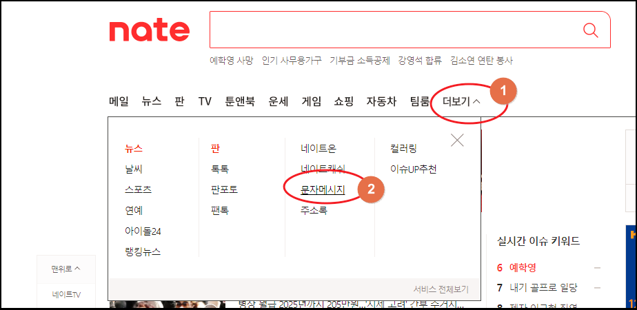 ▼ 네이트 사이트에 접속했습니다. 메일, 뉴스, 판 TV, 운세, 게임, 쇼핑, 자동차 등 여러 가지 메뉴가 보이실 텐데요. 여기서 "더보기" 버튼을 클릭해 주세요. 그럼 "문자 메시지" 메뉴를 찾을 수 있습니다. 클릭해 주세요.