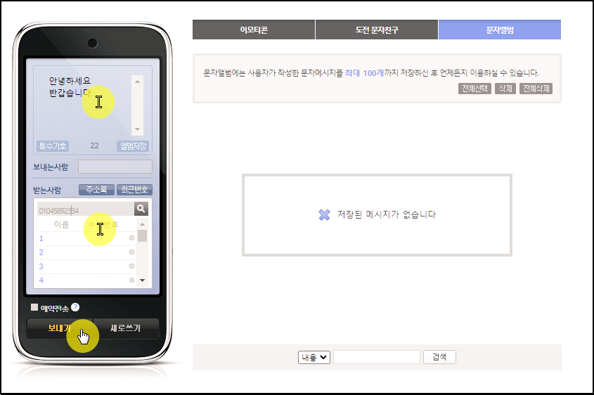 ▼ 무상으로 제공 받은 문자를 사이트 상에서 어떻게 보내면 되는지 방법을 알려드리겠습니다. 간단합니다. 스마트폰 이미지의 상단 화면에 클릭해보세요. 그럼 메세지 내용을 입력할 수 있습니다. 그 다음에는 주소록을 클릭하여 받을 사람을 선택하면 됩니다. 그 아래 있는 수신번호를 입력하여 문자를 보내는 것도 가능합니다.