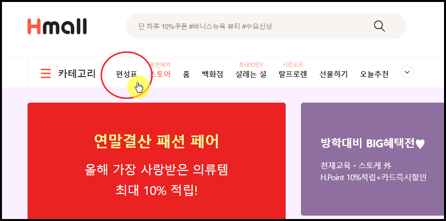 여기에서 "편성표" 메뉴를 선택해 주세요. 최근에 연말결산 패션 페어가 진행되고 있네요. 최대 10% 적립이 된다고 하오니 참고해 주세요. 방학대비 BIG 혜택전도 눈길이 가네요.