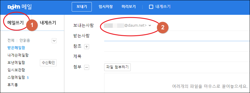 다음 메일 페이지에 접속하면 "메일 쓰기" 버튼을 클릭해 보세요. 그럼 보내는 사람 부분에 자신의 이메일 주소가 나타납니다.