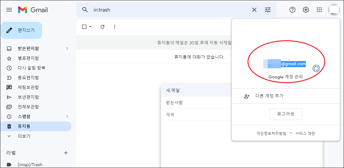 구글 계정으로 지메일 사이트에 로그인을 하면 이메일을 보내거나 받는 것을 할 수 있습니다. 사이트 화면에서 우측 상단에 보면 프로필 버튼이 있는데요. 해당 버튼을 누르면 구글 아이디를 만들 때 같이 생성된 이메일 주소를 확인할 수 있습니다.