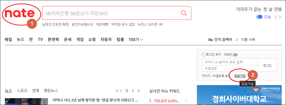장기간 사용할 메일 주소가 추가로 필요한 경우라면 네이트 닷컴을 이용해 보세요. 네이트에 가입하지 않은 사람이 있을 수 있는데요. 여기서 회원가입을 하면 바로 얻을 수 있습니다. 가입한 아이디 @nate.com가 이메일 주소가 됩니다.