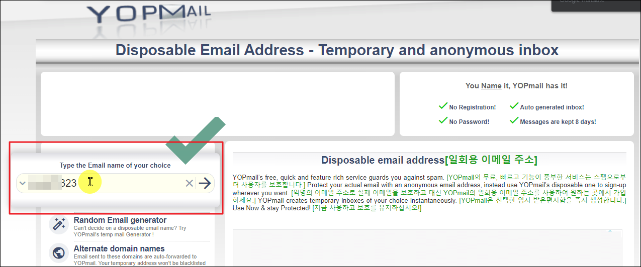 이곳에서 이메일 만드는 방법은 3초면 완료할 수 있습니다. 사이트에 접속하면 좌측에 입력하는 공간이 있습니다. 여기에 마음에 드는 키워드를 입력해 주세요. 그럼 자동으로 나만의 이메일 주소가 생성 됩니다.