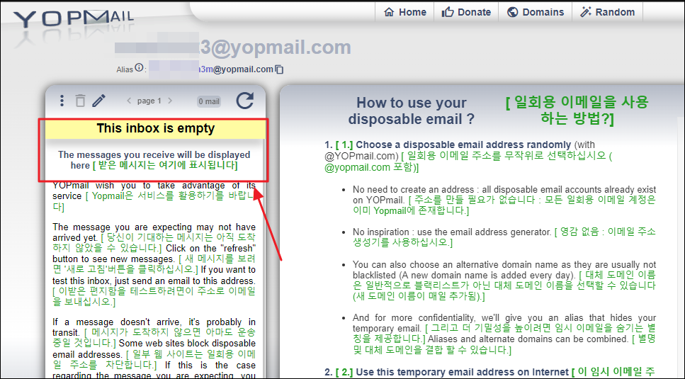 새롭게 화면이 바뀌는데요. 사이트 화면 상단에 보면 방금 만든 이메일 주소가 나타나 있습니다. 복사 버튼을 눌러서 사용하고 싶은 곳에 붙여넣기 하면 됩니다. 우리가 만든 주소로 누가 메일을 보내면 바로 이 화면에 나타납니다.