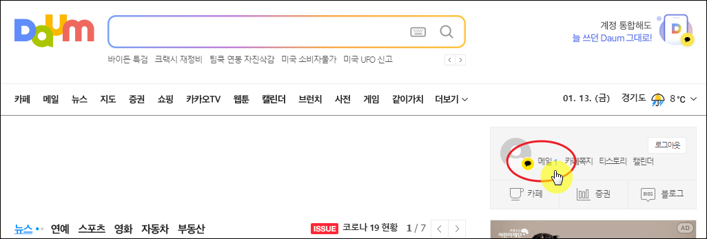 우리나라 사람이라면 다음에서 만든 이메일 주소도 가지고 있을 확률이 높습니다. 다음 사이트에서 로그인을 한 후 "메일" 메뉴를 선택해 보세요.