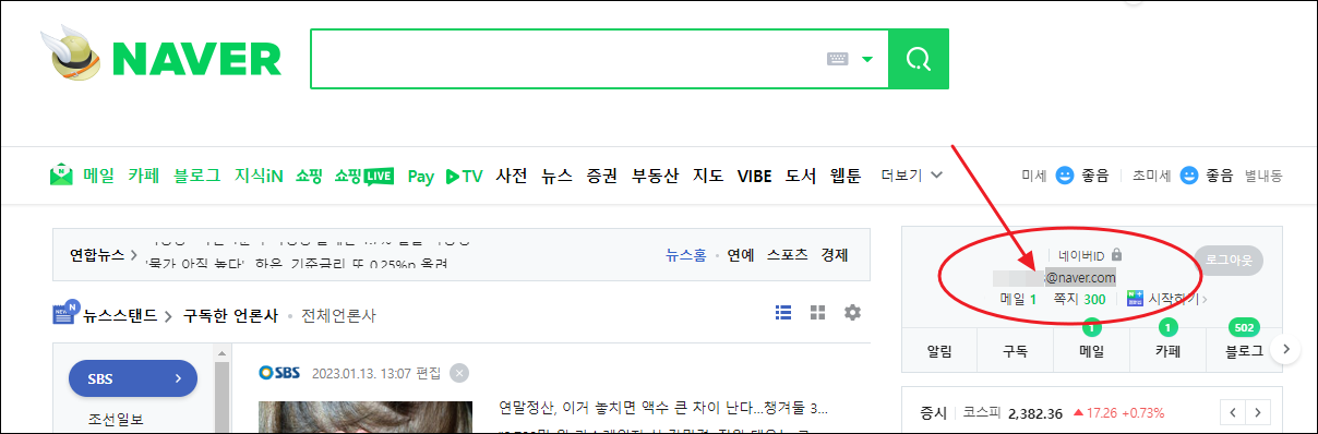 일단 자신도 모르는 메일 주소가 있는지 확인해 주세요. 네이버에 로그인을 하면 이렇게 사이트 화면에서 오른쪽에 자신의 이메일 주소가 표시되어 있습니다.