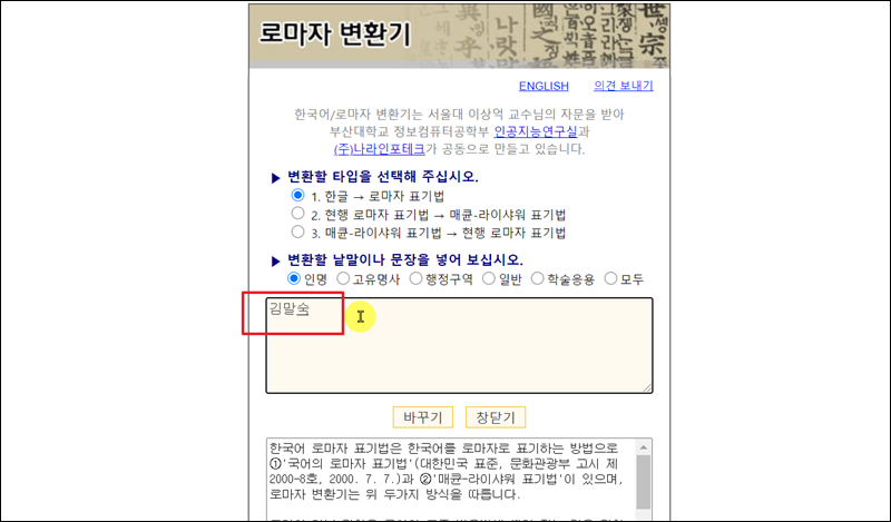 첫 번째는 인명을 포함한 여러 가지 단어를 영어로 바꾸어 주는 변환기 프로그램이에요. 바로 한국어 로마자 변환기 인데요. 프로그램을 설치할 필요가 없고, 사이트에서 바로 이용할 수 있어요.