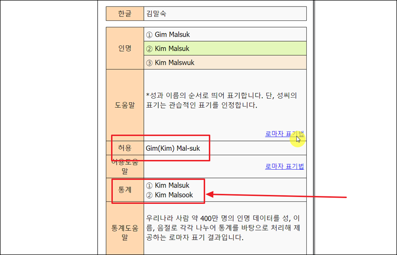 입력한 한글 이름에 대한 변환기의 결과가 나타났어요. 여기서 핵심적으로 봐야 할 부분은 허용과 통계 부분이에요. 기본적으로 허용 부분에 있는 영어 이름을 사용하면 되지만, 아무래도 많은 사람들이 사용하는 통계 부분에 있는 영어 이름이 나을 수 있어요. 서로 비교해보고, 더 괜찮은 것을 사용하면 될 거에요.