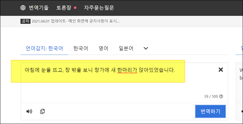 해당 서비스를 이용하는 방법은 어렵지 않아요. 좌측 상단에 있는 입력란에 한글로 번역하고 싶은 문장을 입력해 주세요. 다 입력했다면 "번역하기"를 누릅니다.