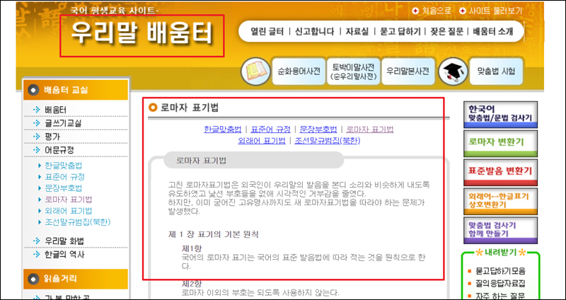 변환기 프로그램에서 "로마자 표기법" 링크를 클릭해 보세요. 그럼 국어 평생교육 사이트인 우리말 배움터에 접속하게 돼요. 직접 한글 이름을 영어로 변환하고 싶거나 변환기 결과에 대해 조금 더 알아보고 싶을 때 이곳의 설명을 참고하면 돼요. 로마자 표기법에 대해 상세히 잘 나와 있어요.