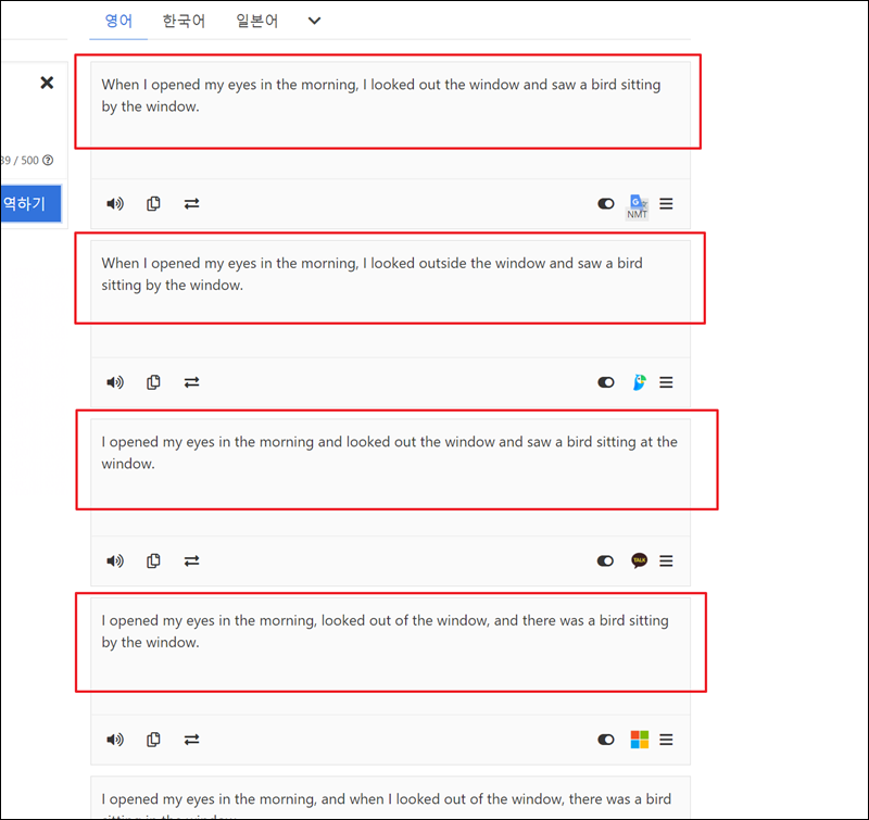 버튼을 누르면 번환기 프로그램의 오른편에 결과가 나타나는데요. 여러 번역 프로그램을 돌린 결과를 모두 확인할 수 있어요. 여기서 한글 문장을 제대로 번역한 영어 문장을 선택해서 사용하면 돼요.