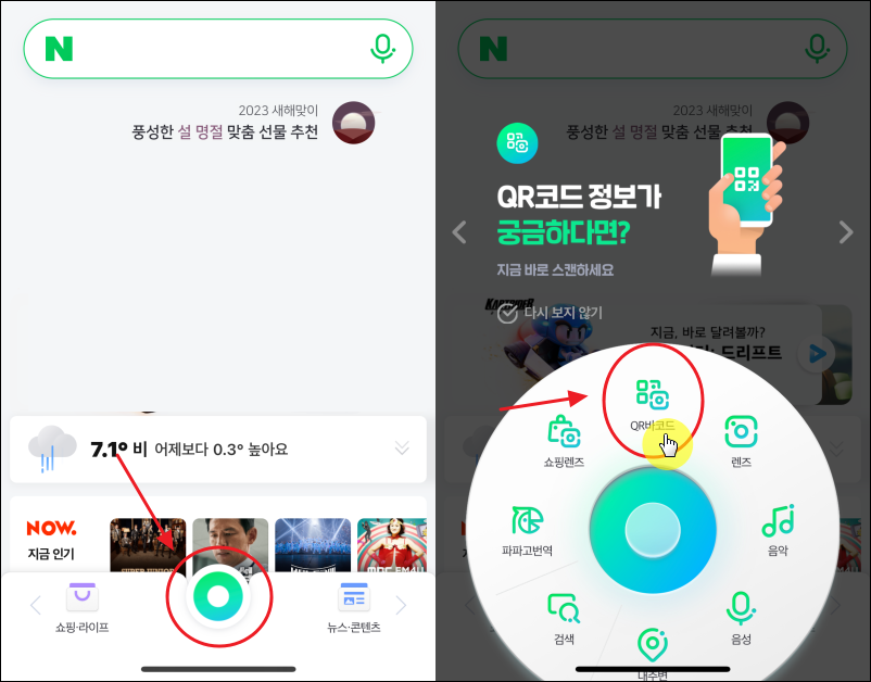 ▼ 네이버 앱이 설치가 완료되면 실행해 보세요. 우리가 자주 보던 검색창과 여러 가지 메뉴가 나타나는데요. 스마트폰 화면 아래쪽을 보면 녹색으로 된 동그란 버튼이 있습니다. 이 버튼을 눌러 보세요. 그럼 여러가지 메뉴가 나타나는데요. 여기서 QR 바코드 메뉴를 선택합니다.
