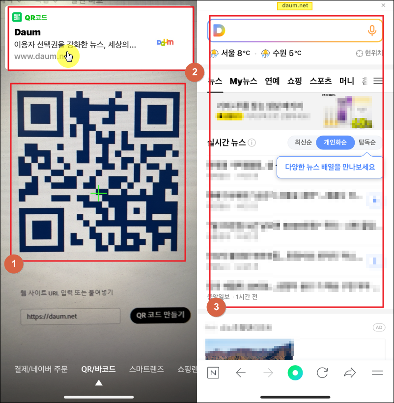 ▼ 스마트폰으로 사진을 찍을 때처럼 화면에 전면 카메라 화면이 나타는데요. 이를 가지고, 스캔 하고 싶은 큐알코드를 찍어 보세요. 그럼 바로 화면 위쪽에 해당 코드를 분석한 결과가 나타납니다. 제가 찍은 큐알코드는 다음 사이트 인데요. 맨 위에 있는 버튼을 누르면 다음 사이트로 바로 이동하게 됩니다.