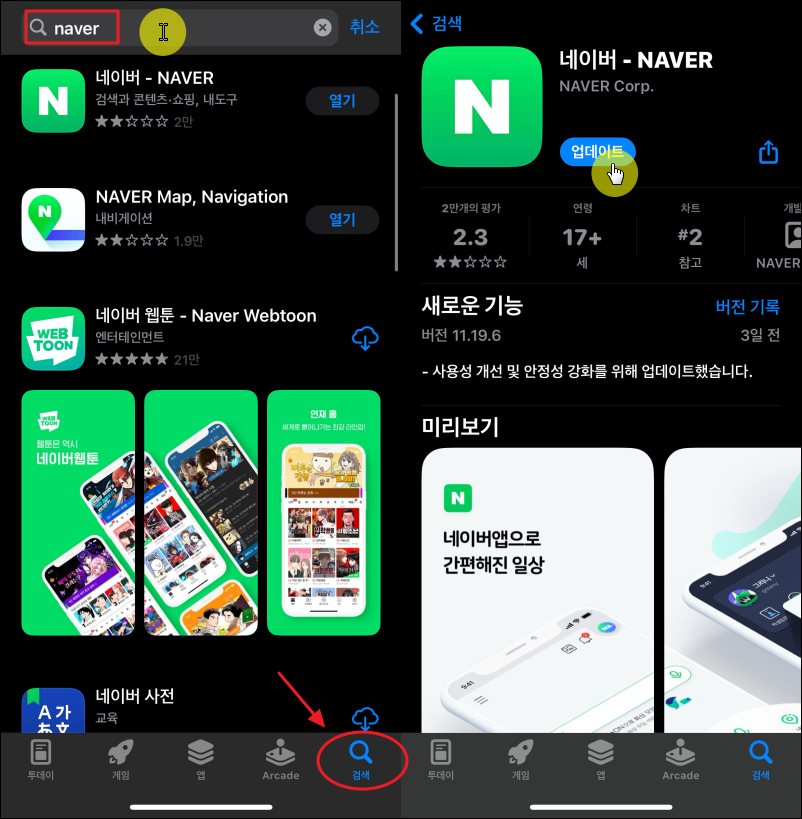 ▼ 스캔을 하는데 있어서 기능이 많은 앱을 하나 알려 드릴게요. 무료로 사용할 수 있고, 우리나라 국민이라면 대부분 이 앱을 이미 설치하고 있었을 수도 있어요. 바로 네이버 앱 인데요. Google Play Store 또는 아이폰의 앱스토어에서 다운 받아 설치해 주세요.