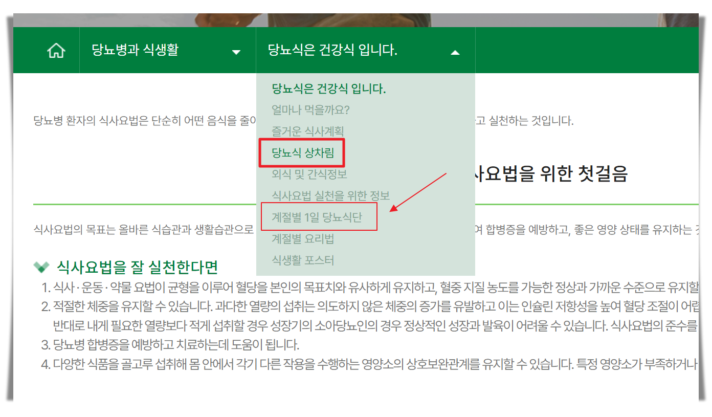 여기서 식단표 작성에 도움이 되는 메뉴는 [당뇨병과 식생활] 입니다.