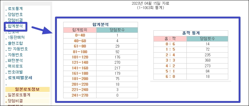로또 전용 게시판이 열렸습니다. 좌측에 있는 소메뉴를 통해 이용하고 싶은 서비스를 선택하면 되는데요. 로또에서 1등 많이한 번호를 확인하고 싶다면 [로또 통계]를 선택하면 되고요. 제가 두 번째로 많이 이용하는 메뉴는 [합계 분석] 입니다. 당첨된 로또의 모든 숫자를 모두 합한 값을 가지고 통계 자료로 만든 것인데요. 총합이 121에서 140 사이인 경우가 270회로 가장 많이 당첨되는 것을 알 수 있습니다. 홀짝 통계의 경우에는 홀수 3개, 짝수 3개의 조합이 368번으로 가장 많이 출현이 되는 것으로 보이고요.